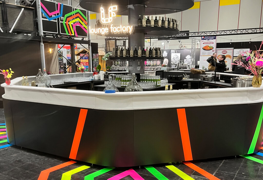 Arbeitshöhe höhenverstellbar von 84-104cm Höhe inkl. Trinkbrett 104-124cm. Individuell kann eine hängende Flaschenetagere zugemietet werden.