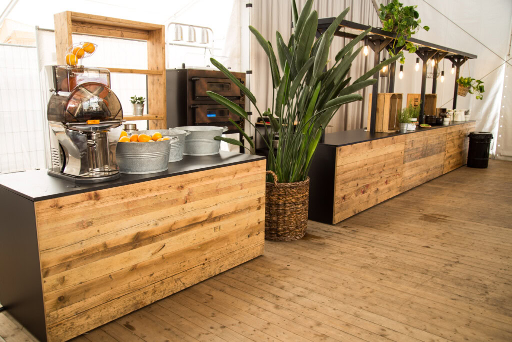 Arbeitshöhe höhenverstellbar von 84-104cm Frontverkleidung Altholzebohle gewachst Seitenverkleidung KS Platte schwarz Arbeitsplatte KS Platte schwarz
